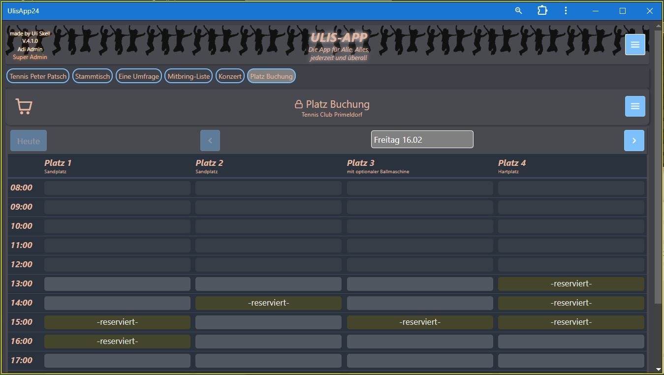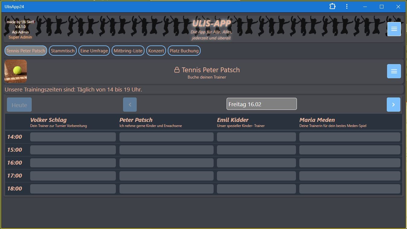 Theo ist Tennis-Trainer. Er will nächste Woche Urlaub machen und hat in seiner Uli's App-Online-Tabelle alle Termine der Woche gesperrt damit keiner eine Trainerstunde in der Woche bucht.
